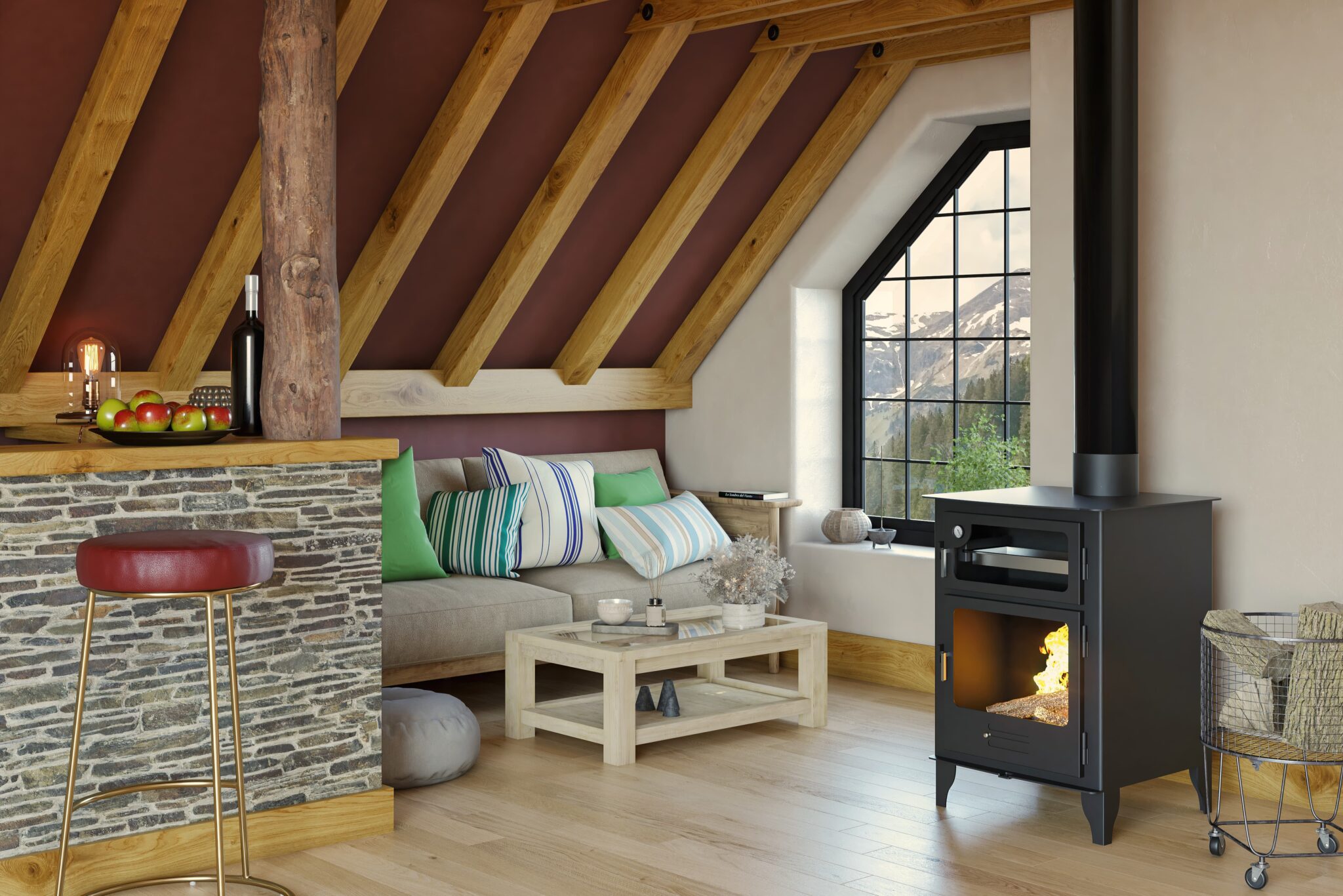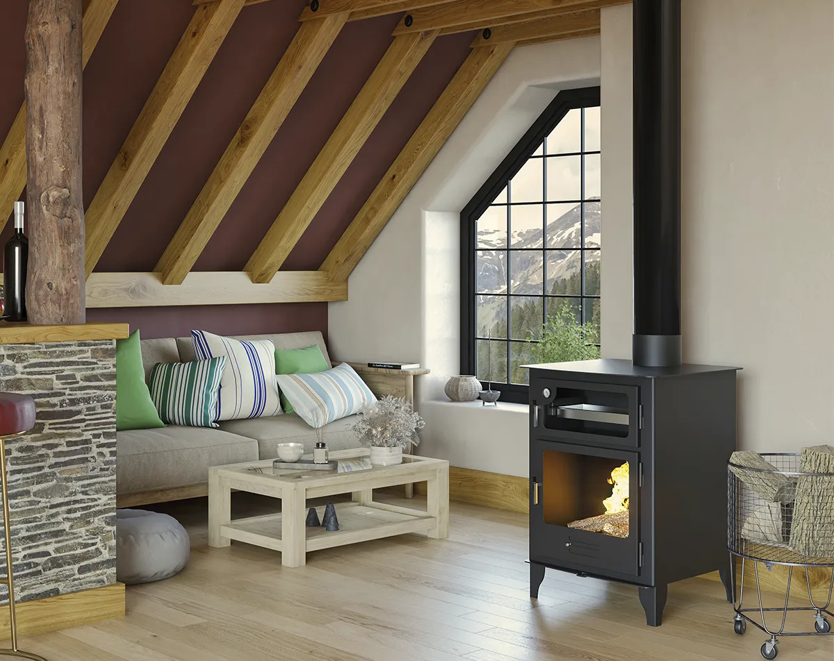 Estufa de leña de estilo tradicional con horno y funcionamiento por convención natural sin necesidad de conexión de la red eléctrica. Sistema de triple combustión, diseñada conforme a la normativa Europea ECODESIGN 2022, con una potencia calorífica de 8 kw y clasificación energética A+. Diseñada para cualquier tipo de estancia con unas medidas de 750 mm (alto) x 535 mm (ancho) x 550 mm (fondo). Fabricada en acero de alta calidad. con una garantía de 2 años. Horno incorporado para una cocción natural.