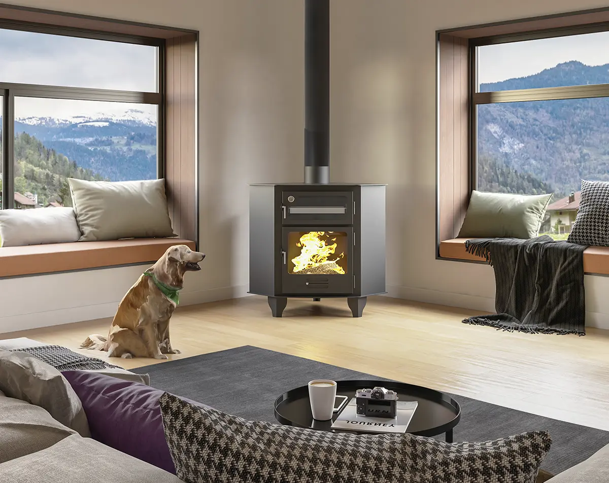 Estufa de leña de estilo tradicional especialmente diseñada para su instalación en rincon y funcionamiento por convención natural sin necesidad de conexión de la red eléctrica. Sistema de triple combustión, diseñada conforme a la normativa Europea ECODESIGN 2022, con una potencia calorífica de 8 kw y clasificación energética A+. Diseñada para cualquier tipo de estancia con unas medias de 750 mm (alto) x 810 mm (ancho) x 610 mm (fondo). Fabricada en acero de alta calidad. con una garantía de 2 años.
