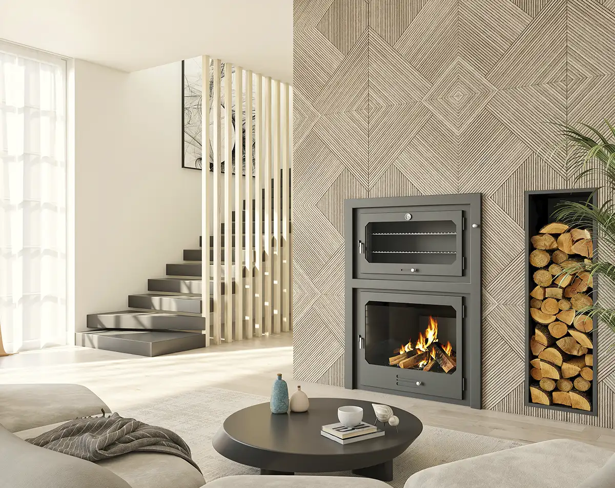 Estufa de leña insertable de estilo innovador y funcionamiento por convención natural sin necesidad de conexión de la red eléctrica. Sistema de triple combustión, diseñada conforme a la normativa Europea ECODESIGN 2022, con una potencia calorífica de 17,50 kw y clasificación energética A. Diseñada para cualquier tipo de estancia con unas medidas de 1220 mm (alto) x 900 mm (ancho) x 580 mm (fondo). Fabricada en acero de alta calidad. con una garantía de 2 años.
