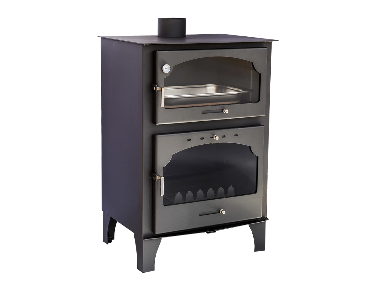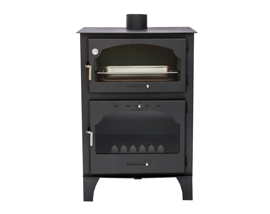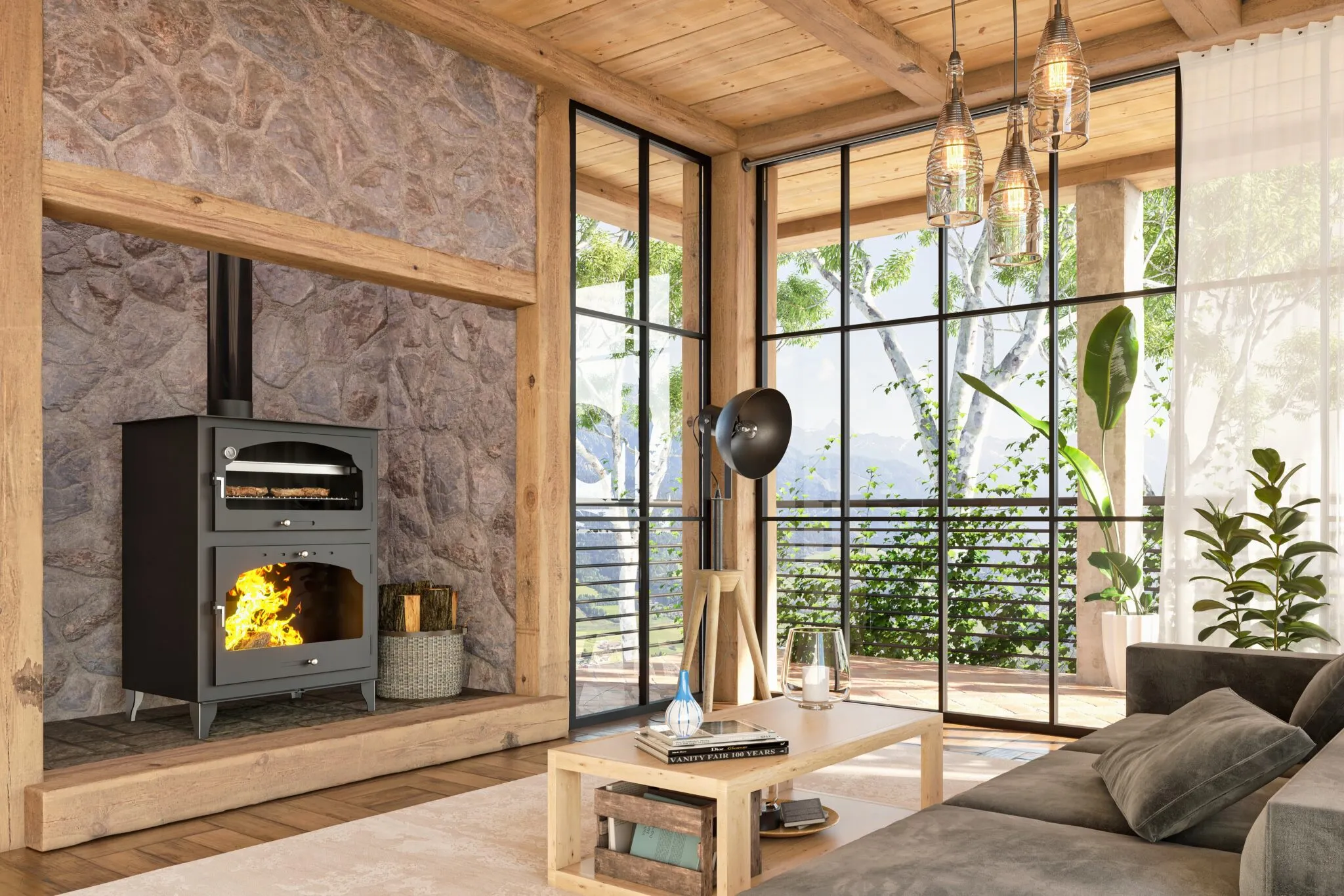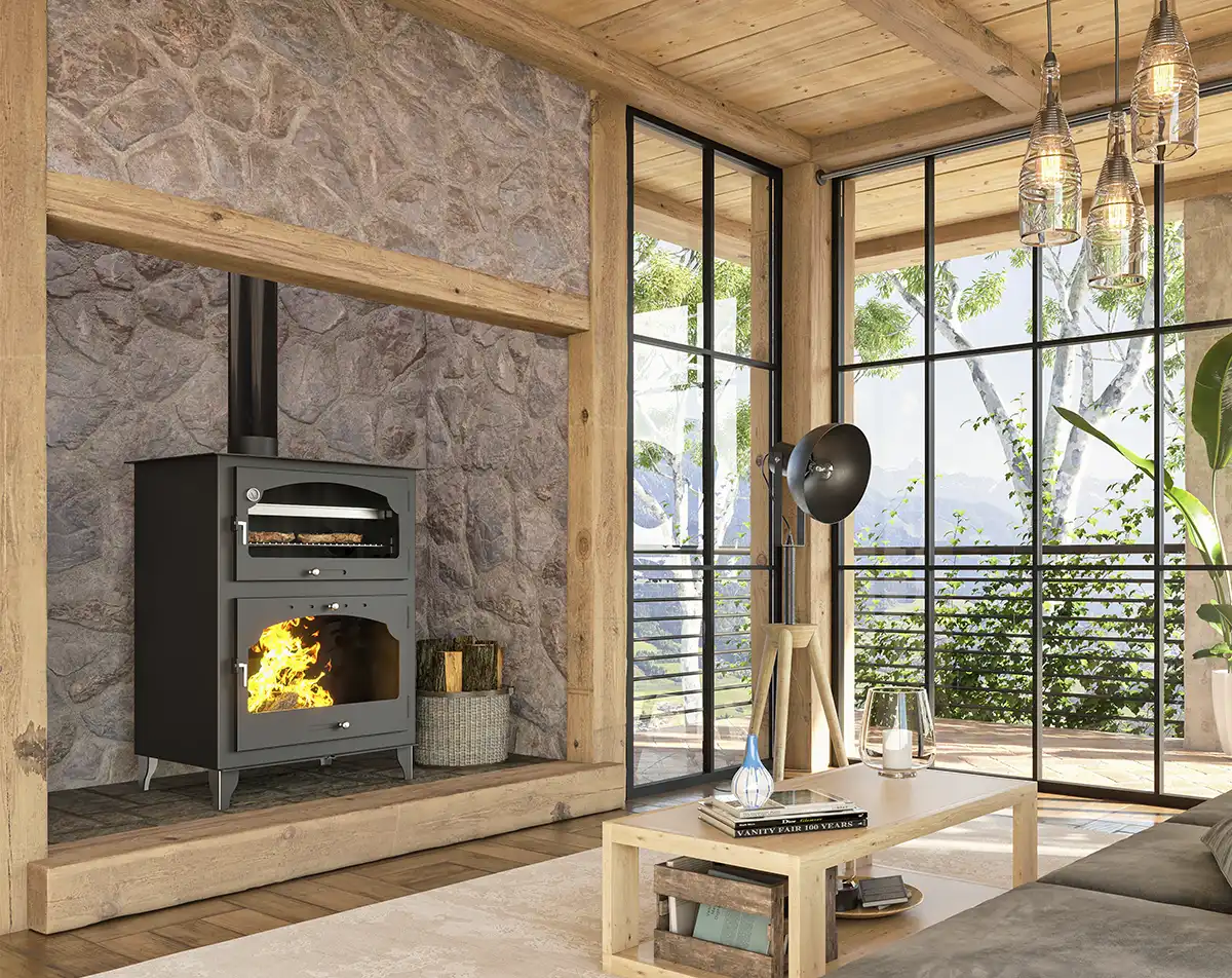 Estufa de leña con horno de estilo moderno y funcionamiento por convención natural sin necesidad de conexión de la red eléctrica. Sistema de triple combustión, diseñada conforme a la normativa Europea ECODESIGN 2022, con una potencia calorífica de 9 kw y clasificación energética A+. Diseñada para cualquier tipo de estancia con unas medidas de 1100 mm (alto) x 750 mm (ancho) x 580 mm (fondo). Fabricada en acero de alta calidad. con una garantía de 2 años. Horno incorporado para una cocción natural.