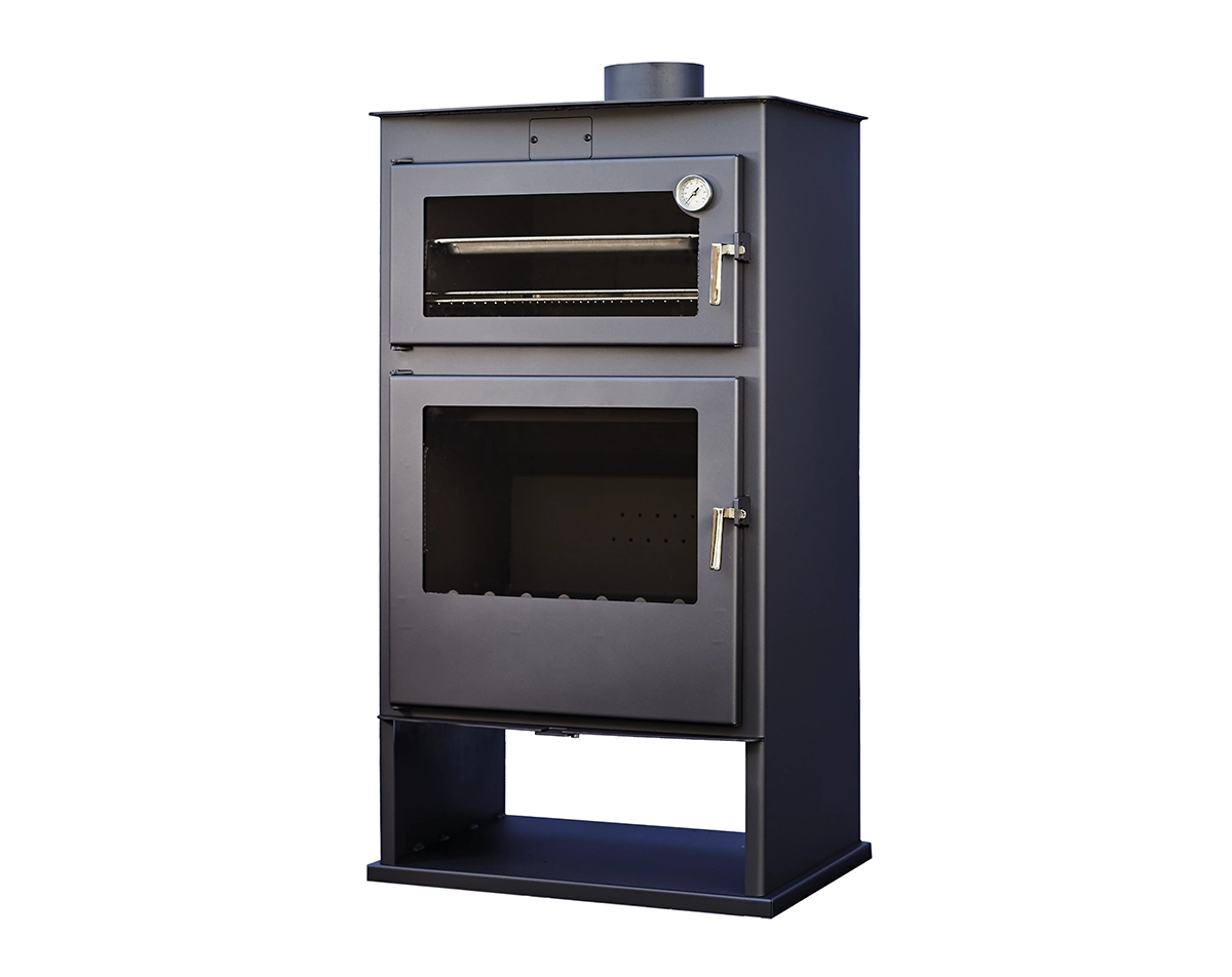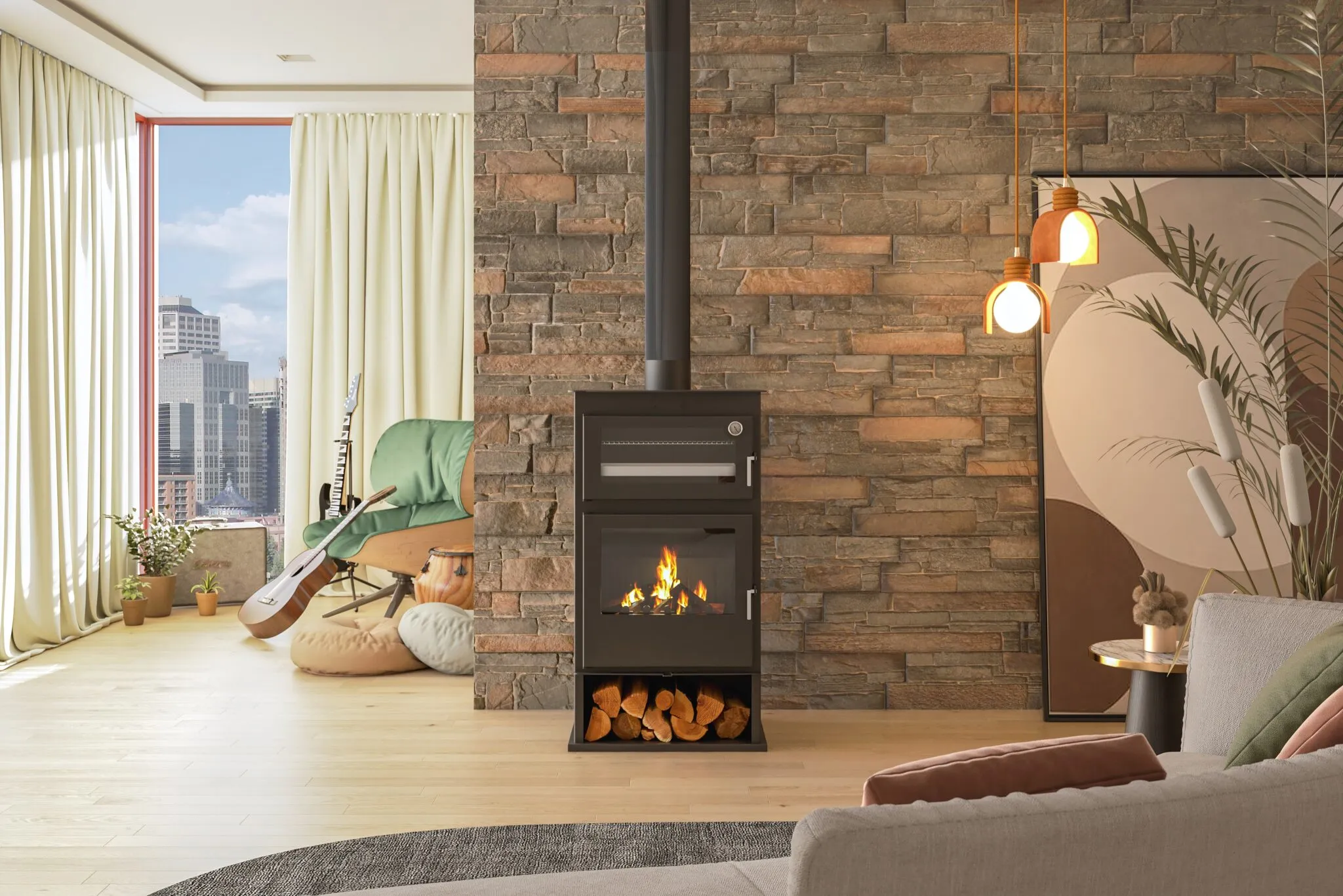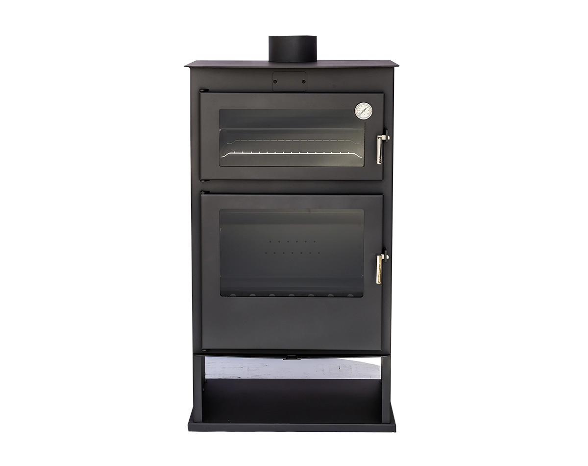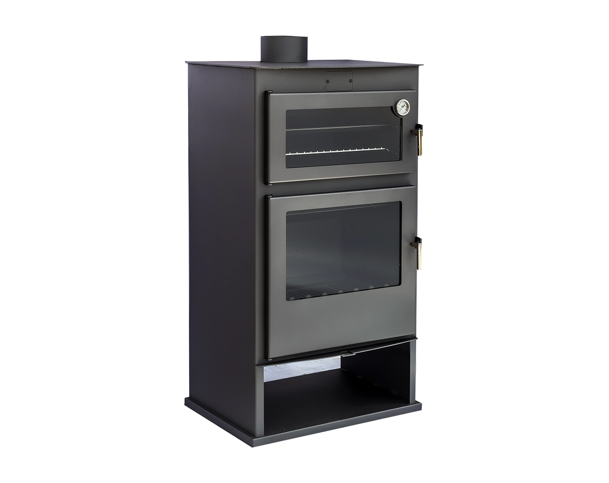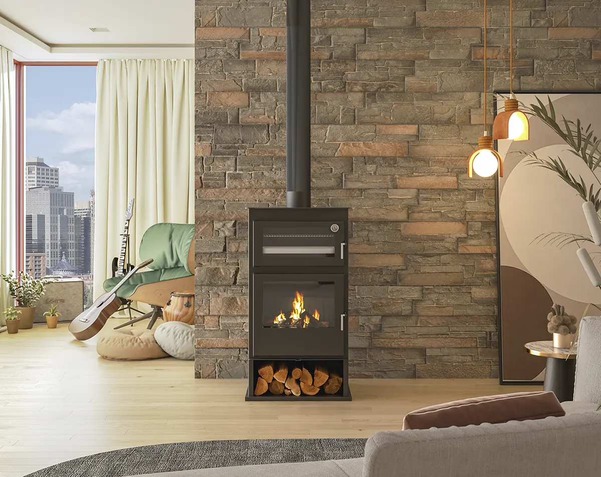 Estufa de leña con horno de estilo moderno y funcionamiento por convención natural sin necesidad de conexión de la red eléctrica. Sistema de triple combustión, diseñada conforme a la normativa Europea ECODESIGN 2022, con una potencia calorífica de 11,60 kw y clasificación energética A. Diseñada para cualquier tipo de estancia con unas medidas de 1170 mm (alto) x 650 mm (ancho) x 490 mm (fondo). Fabricada en acero de alta calidad. con una garantía de 2 años. Horno incorporado para una cocción natural.
