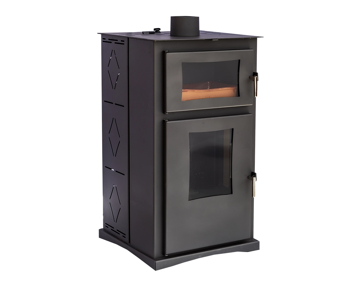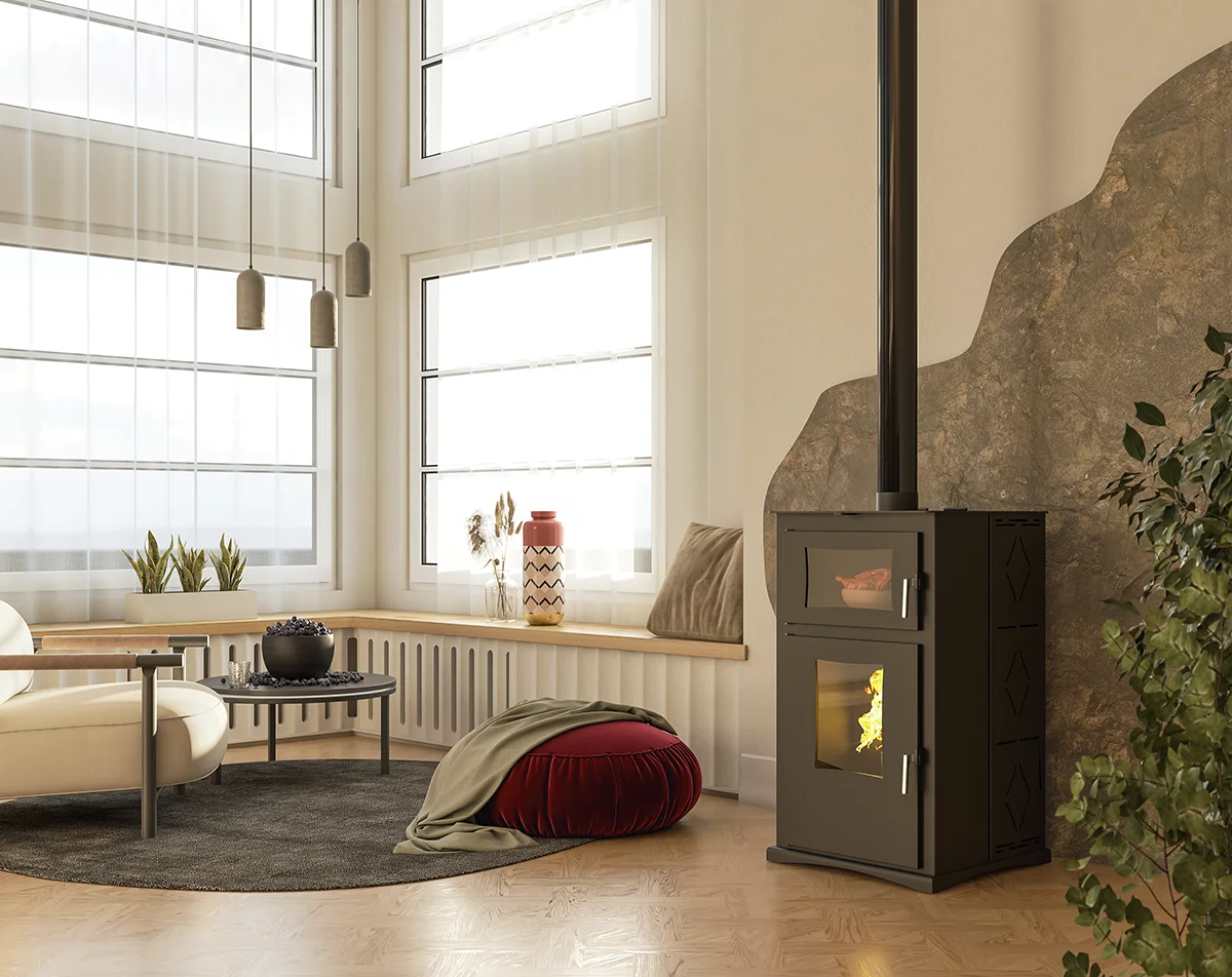Estufa de pellets con horno de estilo moderno y funcionamiento por convención natural sin necesidad de conexión de la red eléctrica. Sistema de doble combustión, diseñada conforme a la normativa Europea ECODESIGN 2022, con una potencia calorífica de 8,25 kw y clasificación energética A+. Diseñada para cualquier tipo de estancia con unas medidas de 950 mm (alto) x 545 mm (ancho) x 545 mm (fondo). Fabricada en acero de alta calidad. con una garantía de 2 años. Horno incorporado para una cocción natural.